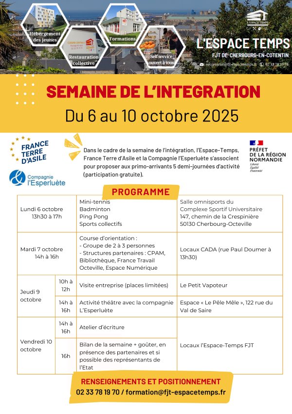 La semaine de l’intégration fût riche et de tous horizons ! Organisée par le service formation de L’Espace Temps en partenariat avec France Terre d’Asile et l’Esperluette, cette semaine s’adresse aux primo-arrivants. Elle se voulait plurielle, active et accueillante. Au programme de cette semaine de l’intégration 2025 : 5 demi-journées d’activités sportives, culturelles et de connaissance de tissus local (économique, institutionnel). Pour clore cette semaine, un goûter pour tous et un premier bilan ont été proposés aux participants, aux partenaires et